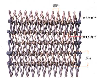 網(wǎng)帶的標(biāo)注方法: 螺距:網(wǎng)條螺旋環(huán)中最近兩個(gè)環(huán)絲的中心距。 節(jié)距:網(wǎng)條螺旋環(huán)面中環(huán)絲的最大外量距離。
