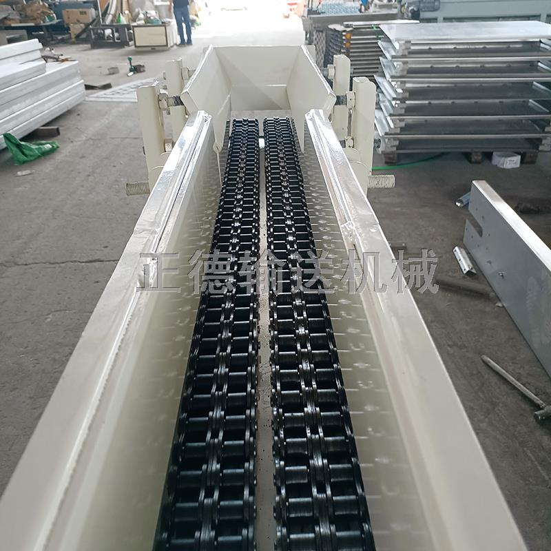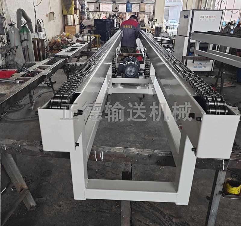鏈條輸送機是以鏈條作為牽引和承載體輸送物料,鏈條可以采用普通的套筒滾子輸送鏈,也可采用其它各種特種鏈條(如積放鏈,倍速鏈)。鏈條輸送機的輸送能力大,主要輸送托盤、大型周轉(zhuǎn)箱等。輸送鏈條結(jié)構(gòu)形式多樣,并且有多種附件,易于實現(xiàn)積放輸送,可用做裝配生產(chǎn)線或作為物料的儲存輸送