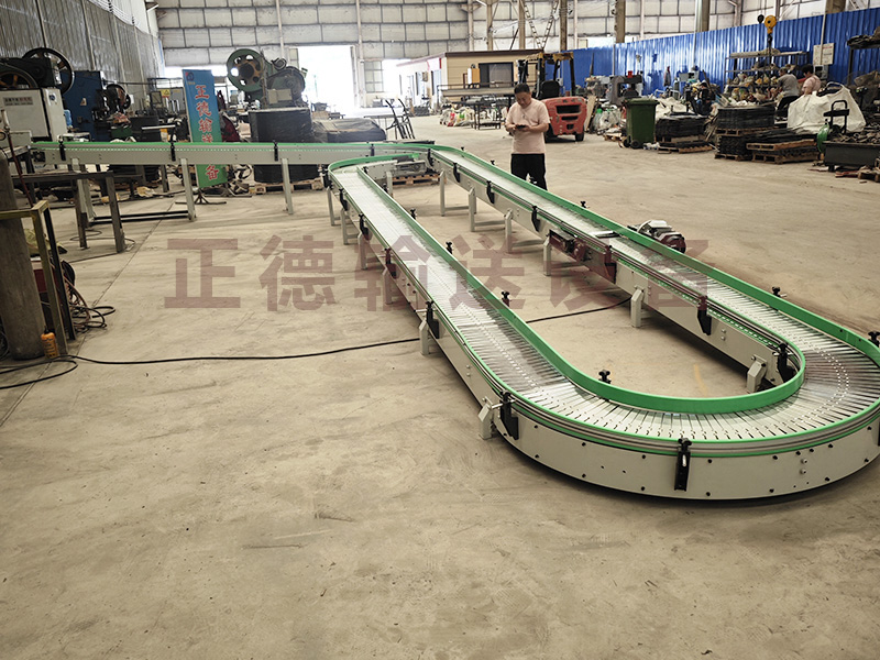 鏈板輸送機(jī)是一種以標(biāo)準(zhǔn)鏈板為承載面,由馬達(dá)減速機(jī)為動(dòng)力傳動(dòng)的傳送裝置。鏈板式輸送機(jī),由動(dòng)力裝置(電機(jī))、傳動(dòng)軸、滾筒、張緊裝置、鏈輪、鏈條、軸承、潤滑劑、鏈板等等構(gòu)成。其中帶動(dòng)物料的輸送的主要的兩個(gè)部分為:鏈條,利用它的循環(huán)往復(fù)運(yùn)動(dòng)提供牽引動(dòng)力;金屬板,作為輸送過程中的承載體?梢酝ㄟ^多列鏈板并行,使鏈板輸送機(jī)做的很寬并形成差速,利用多列鏈板的速度差使多列輸送在無擠壓的情況下變?yōu)閱瘟休斔,從而滿足飲料貼標(biāo)、灌裝、清洗等設(shè)備的單列輸送的要求,我們可以將兩條鏈板輸送機(jī)的頭尾部做成重疊式的混合鏈?zhǔn)沟闷浚ü蓿w處于動(dòng)態(tài)過度狀態(tài),使輸送線上不滯留物料,可以滿足空瓶以及實(shí)瓶壓力和無壓力輸送。