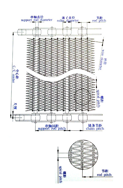 網(wǎng)帶的標(biāo)注方法: 螺距:網(wǎng)條螺旋環(huán)中最近兩個(gè)環(huán)絲的中心距。 節(jié)距:網(wǎng)條螺旋環(huán)面中環(huán)絲的最大外量距離。