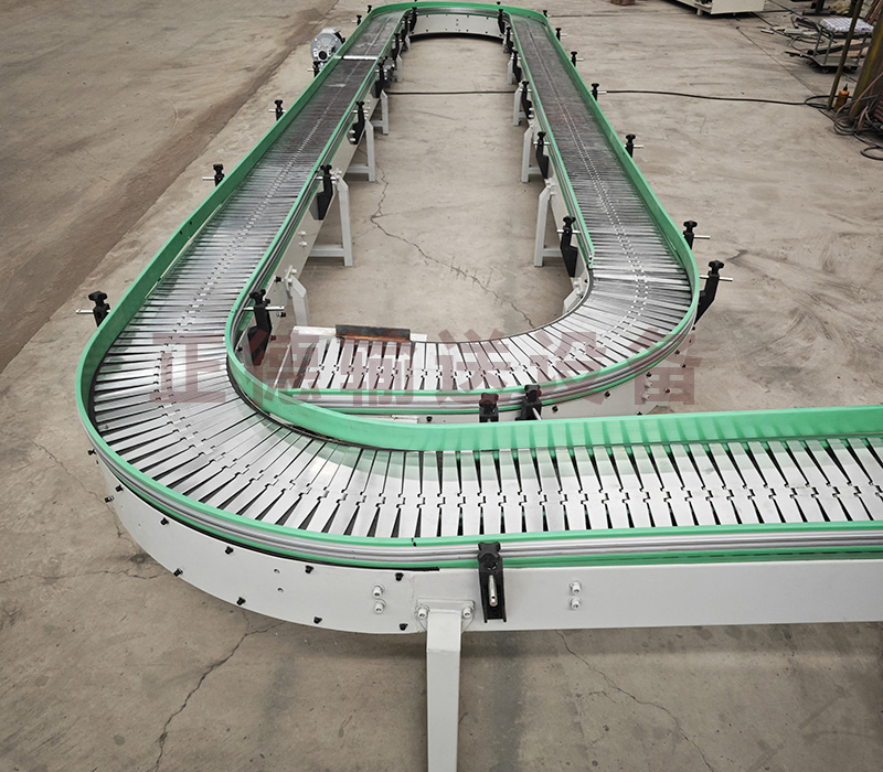 鏈板輸送機(jī)是一種以標(biāo)準(zhǔn)鏈板為承載面,由馬達(dá)減速機(jī)為動(dòng)力傳動(dòng)的傳送裝置。鏈板式輸送機(jī),由動(dòng)力裝置(電機(jī))、傳動(dòng)軸、滾筒、張緊裝置、鏈輪、鏈條、軸承、潤滑劑、鏈板等等構(gòu)成。其中帶動(dòng)物料的輸送的主要的兩個(gè)部分為:鏈條,利用它的循環(huán)往復(fù)運(yùn)動(dòng)提供牽引動(dòng)力;金屬板,作為輸送過程中的承載體?梢酝ㄟ^多列鏈板并行,使鏈板輸送機(jī)做的很寬并形成差速,利用多列鏈板的速度差使多列輸送在無擠壓的情況下變?yōu)閱瘟休斔,從而滿足飲料貼標(biāo)、灌裝、清洗等設(shè)備的單列輸送的要求,我們可以將兩條鏈板輸送機(jī)的頭尾部做成重疊式的混合鏈?zhǔn)沟闷浚ü蓿w處于動(dòng)態(tài)過度狀態(tài),使輸送線上不滯留物料,可以滿足空瓶以及實(shí)瓶壓力和無壓力輸送。